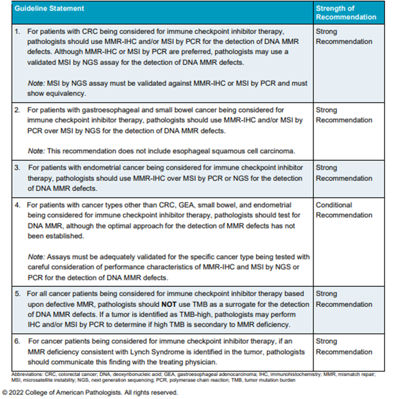 - 82. CAP. Mismatch Repair and Microsatellite Instability Testing for Immune Checkpoint Inhibitor Therapy. College of American Pathologists. Updated August 3, 2022. https://www.cap.org/protocols-and-guidelines/cap-guidelines/current-cap-guidelines/mismatch-repair-and-microsatellite-instability-testing-for-immune-checkpoint-inhibitor-therapy